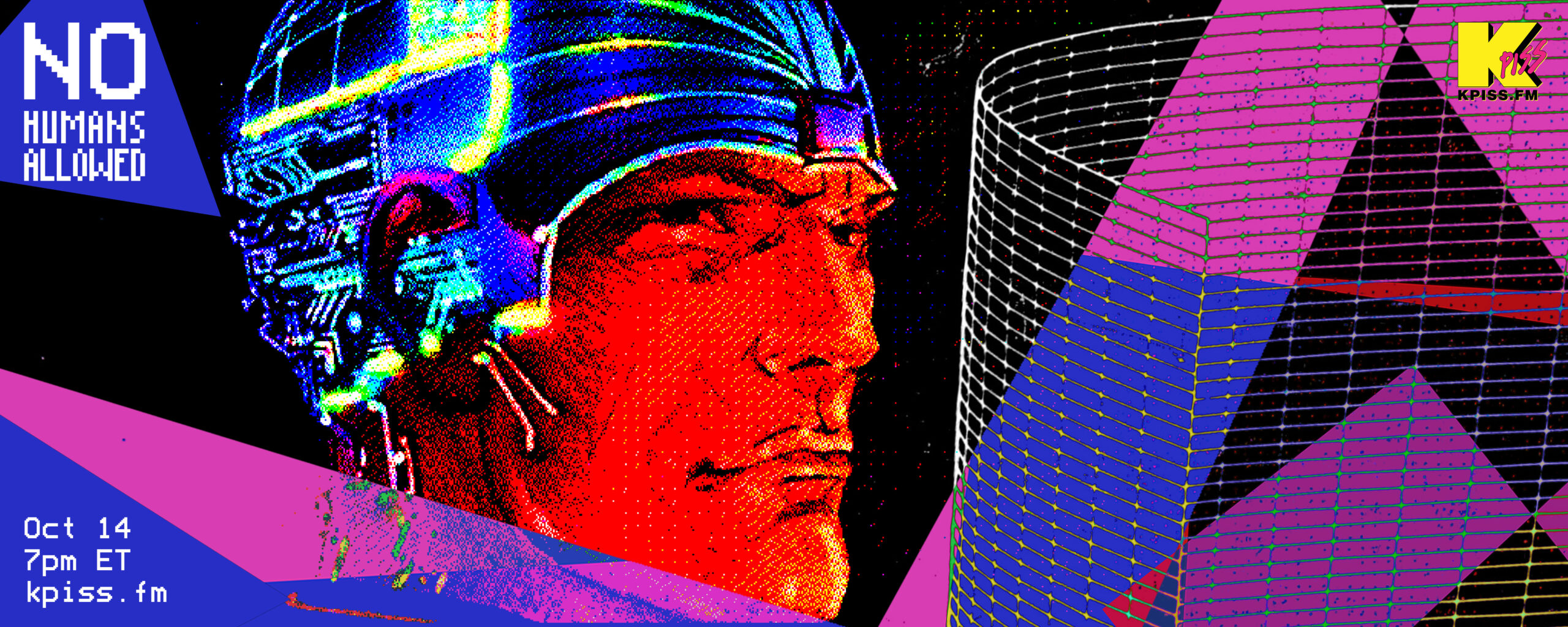 No Humans Allowed is Brian Blackout’s award-winning, weekly robots-themed radio show on internet station KPISS.fm. Machine vibes 4 machines. Songs for robots, androids, mandroids, cyborgs, AIs, cylons, skinjobs, roombas, wifi routers, smart devices, anything colored Bondi blue, and virtual assistants. Humans not required. Broadcasts live every Wednesday at 6pm CT on kpiss.fm, with over 200 episodes now streamable in the archives on topics like and Beach Simulations, Roomba dance parties, undersea adventures + Cyber Texas.