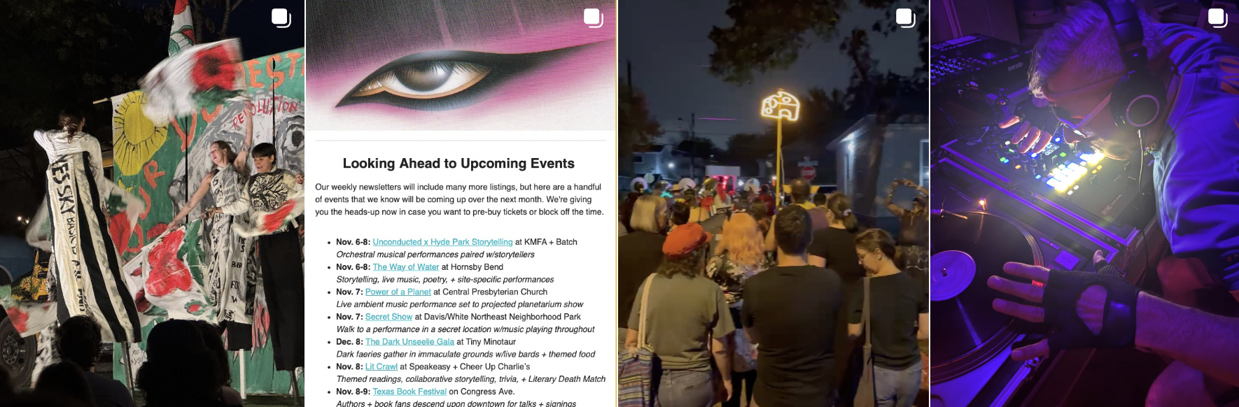 We are Leila + Brian. We make this newsletter. We do our own events, most often No Lights No Lycra, + also BYOT, a party where we share very good YouTubes (here’s a playlist from the last one). We go very hard seeing bands at SxSW (here are playlists of our favorites from 2025). We once got called “local Austin couple” by KXAN. We do some other stuff here and there. We love going out to creative events in Austin, and we want you to join us. Visit us at liteandbriteatx.com, and support us on Patreon if you like what we do.