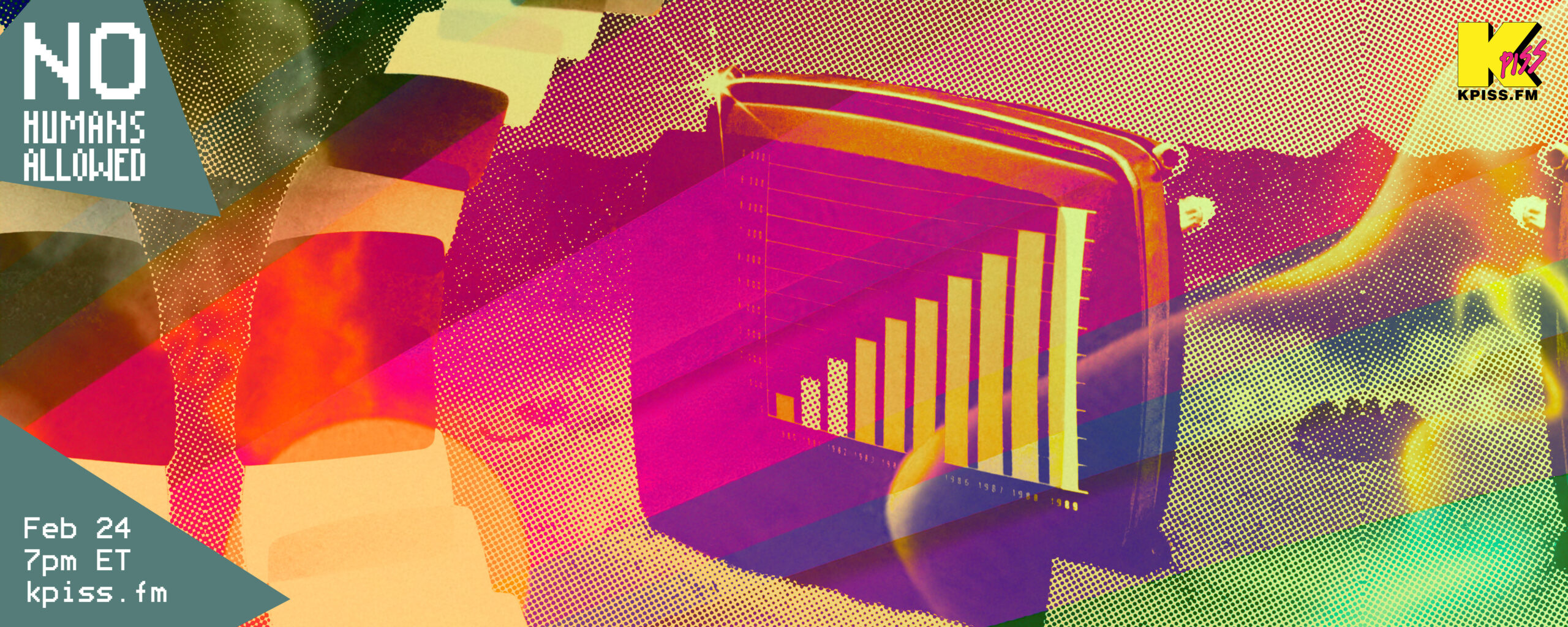 No Humans Allowed is Brian Blackout’s award-winning, weekly robots-themed radio show on internet station KPISS.fm. Machine vibes 4 machines. Songs for robots, androids, mandroids, cyborgs, AIs, cylons, skinjobs, roombas, wifi routers, smart devices, anything colored Bondi blue, and virtual assistants. Humans not required. Broadcasts live every Wednesday at 6pm CT on kpiss.fm, with over 200 episodes now streamable in the archives on topics like and Beach Simulations, Roomba dance parties, undersea adventures + Cyber Texas.